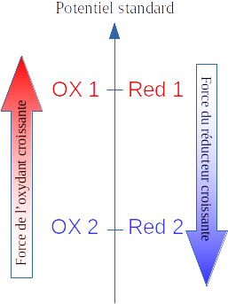 Dans l'illustration ci-contre, la réaction qui se produit effectivement est celle entre l'oxydant du premier couple (OX 1) avec le réducteur du deuxième (Red 2).