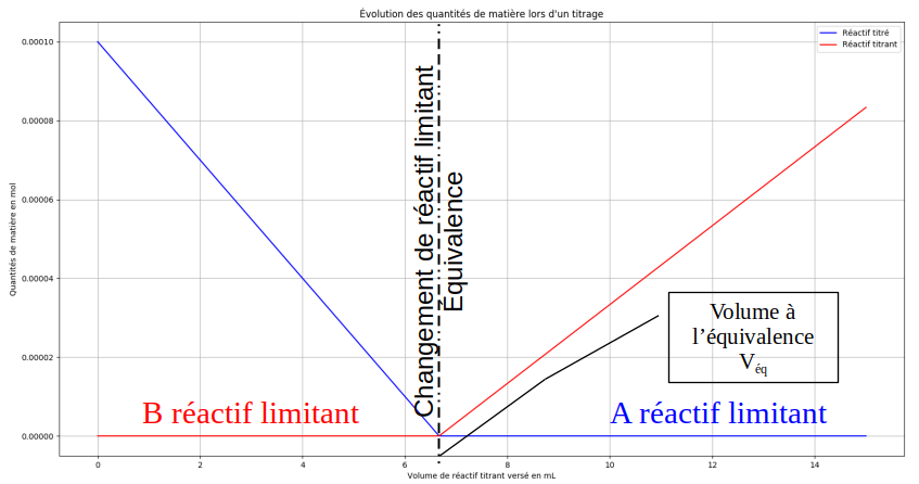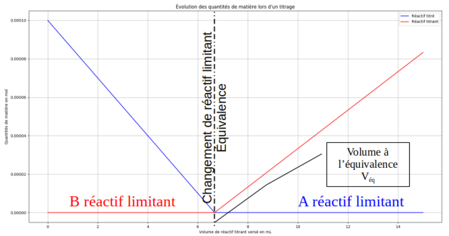 Le graphique ci-dessous représente les variations des quantités de matière du réactif titré et du réactif titrant en fonction du volume de réactif titrant versé.
