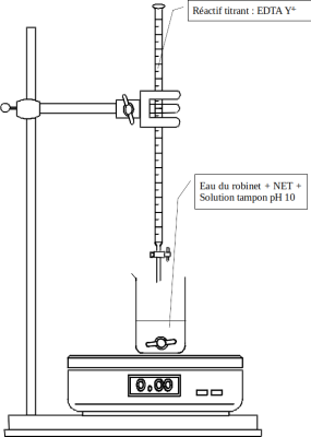 L'équivalence est repérée par le changement de couleur de d'un indicateur coloré : le noir ériochrome T (NET) qui forme un ion complexe rose en présence d'ions calcium et magnésium alors qu'il est bleu en leur absence.