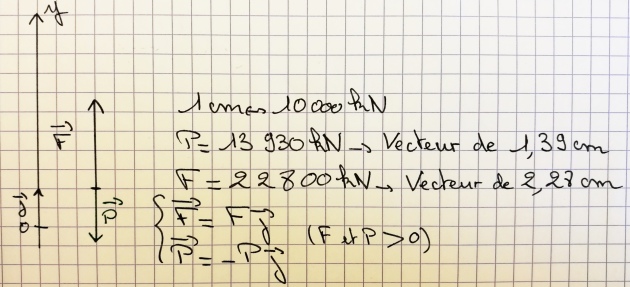 poids \(\vec P = m \cdot \vec g\) : vertical, dirigé vers le sol, \(P = 1420\times 10^3 \times 9{,}81 \simeq1{,}393\times 10^7 \ \mathrm N\simeq 13930\ \mathrm{kN}\) ;