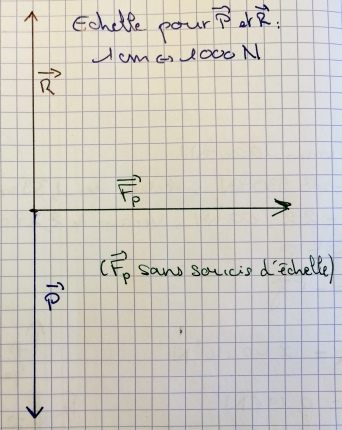 la réaction de la glace \(\vec R\) : verticale, dirigée vers le haut, compense exactement le poids donc \(R=P\)
