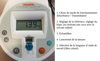 L'appareil utilisé n'est pas à proprement parler un spectrophotomètre. Il ne permet pas de balayer l'ensemble des longueurs d'onde du spectre visible. Seules quelques longueurs d'onde de travail peuvent être sélectionnées à l'aide de filtres colorés.
