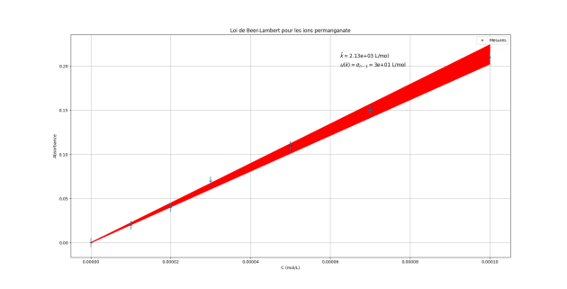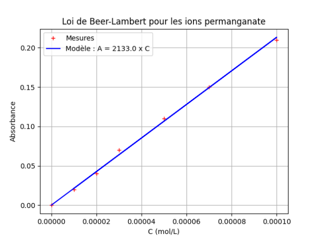 Le programme en Python donne la valeur du coefficient de proportionnalité entre l'absorbance A et la concentration en ions permanganate \(C_{MnO_4^-}\) : \(k=2133\ \mathrm{L \cdot mol^{-1}}\).
