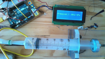 On relie une seringue à un capteur de pression connecté à un micro contrôleur permettant l'affichage de la pression en hectopascal (hPa).