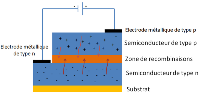 En ce qui concerne l'émission de lumière par la DEL, celle-ci a lieu lorsque des électrons de la bande de conduction se recombinent avec des "trous" dans la zone de recombinaison. Lorsque la DEL conduit le courant électrique, électrons et trous migrent en sens inverses dans le composant. En se recombinant, l'électron cède l'énergie qu'il possédait pour retomber dans la bande de conduction en émettant un photon de fréquence \(\mathbf{\nu}\), donc d'énergie \(E_{photon}=h \cdot \nu\).