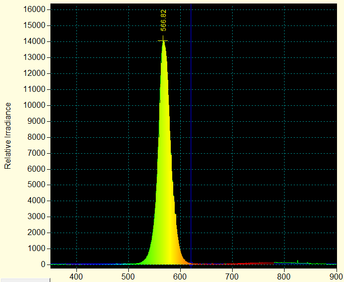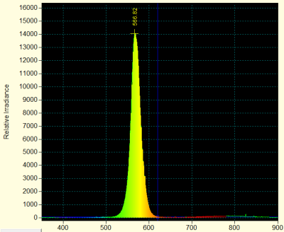 L'exemple ci-contre montre le spectre d'émission d'une DEL de couleur verte. On considérera dans la suite que la lumière émise est monochromatique avec pour longueur d'onde celle correspondant au pic d'intensité.