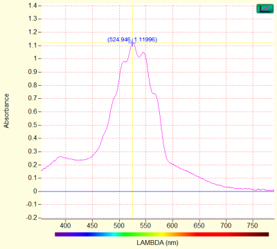 Ci-contre, le spectre d'absorption des ions permanganate \(\left(MnO_4 ^{-} \right)\). Il montre un pic d'absorption intense au niveau de la longueur d'onde \(\lambda=525\ \mathrm{nm}\).