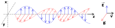 L'onde lumineuse est une onde électromagnétique. Elle est constituée d'un champ électrique \(\vec E\) et d'un champ magnétique \(\vec B\) structurés comme sur la figure ci-contre : le trièdre \(\left(\vec E{,}\vec B{,}\vec v \right)\) est direct.