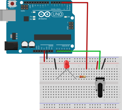 La DEL est connectée à la sortie numérique n°3 et le curseur du potentiomètre est relié à l'entrée analogique A0.