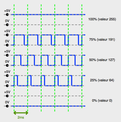 Certaines sorties numériques de la carte Arduino sont repérées par le symbole ~. Il s'agit de sorties dites PWM, pour Pulse Width Modulation. Autrement dit, elles peuvent délivrer des trains d'impulsions entre 0 et 5 volts où le pourcentage de temps à l'état haut est ajustable sur 256 paliers (voir illustration ci-contre)